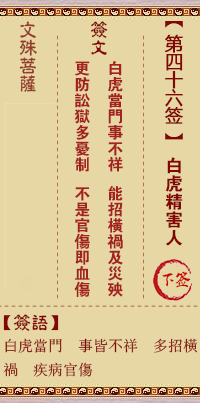 簽詩:白虎當門事不祥,能招橫禍及災(zāi)殃,更防訟獄多憂制,不是官傷即血傷。