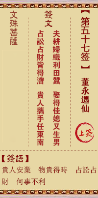 簽詩:夫耕婦織利田蠶,娶得佳媳又生男,占訟占財皆得濟,貴人攜手任東南。
