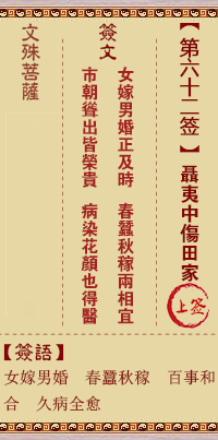 簽詩(shī):女嫁男婚正及時(shí),春蠶秋稼兩相宜,市朝聳出皆榮貴,病染花顏也得醫(yī)。