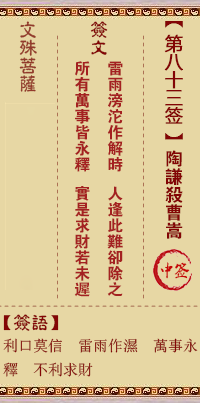 簽詩:雷雨滂沱作解時,人逢此難卻除之,所有萬事皆永釋,實是求財若未遲。