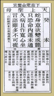 蛇身意欲變成龍以這樣的條件而要成就非凡之事,這是有困難的重要關(guān)鍵字句解說:代表當(dāng)前想要成就之事,困難達(dá)成。因?yàn)楸旧項(xiàng)l件或身分不太夠。只恐命內(nèi)運(yùn)未通只恐怕命運(yùn)沒有這么暢通久病且作寬心坐若條件不好,那就放輕松吧言語雖多不可從旁人的意見雖多,但是不要依從重要關(guān)鍵字句解說:因?yàn)橐缽姆炊闆r更糟。