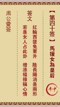 此簽有”知禮盡孝”之意。意味當事人,不論男女,都應知禮法、盡孝道??鬃诱f:”非禮勿視、非禮勿言、非禮勿聽、非禮勿動?!比吮仨毤s束自己的行為舉止,凡事都不應越矩。現(xiàn)今電視節(jié)目、電影、網(wǎng)路、書籍等,會污染身心產(chǎn)生妄想邪念的,不應看。不道人之短,不說己之長,不過問別人的隱私。別人在說八卦、私事,不關自己的事,避得遠遠的,不聽。不做違反道德良心的事。凡事真誠、尊重、為他人著想,即是知禮。盡孝道是做人的根本,莫忘父母生養(yǎng)之恩,凡事勿讓父母操心,時刻掛念、問候關心,而不只是在金錢上的供養(yǎng)。守禮盡孝是道德的根本,不會因為時代變遷而有所改變。